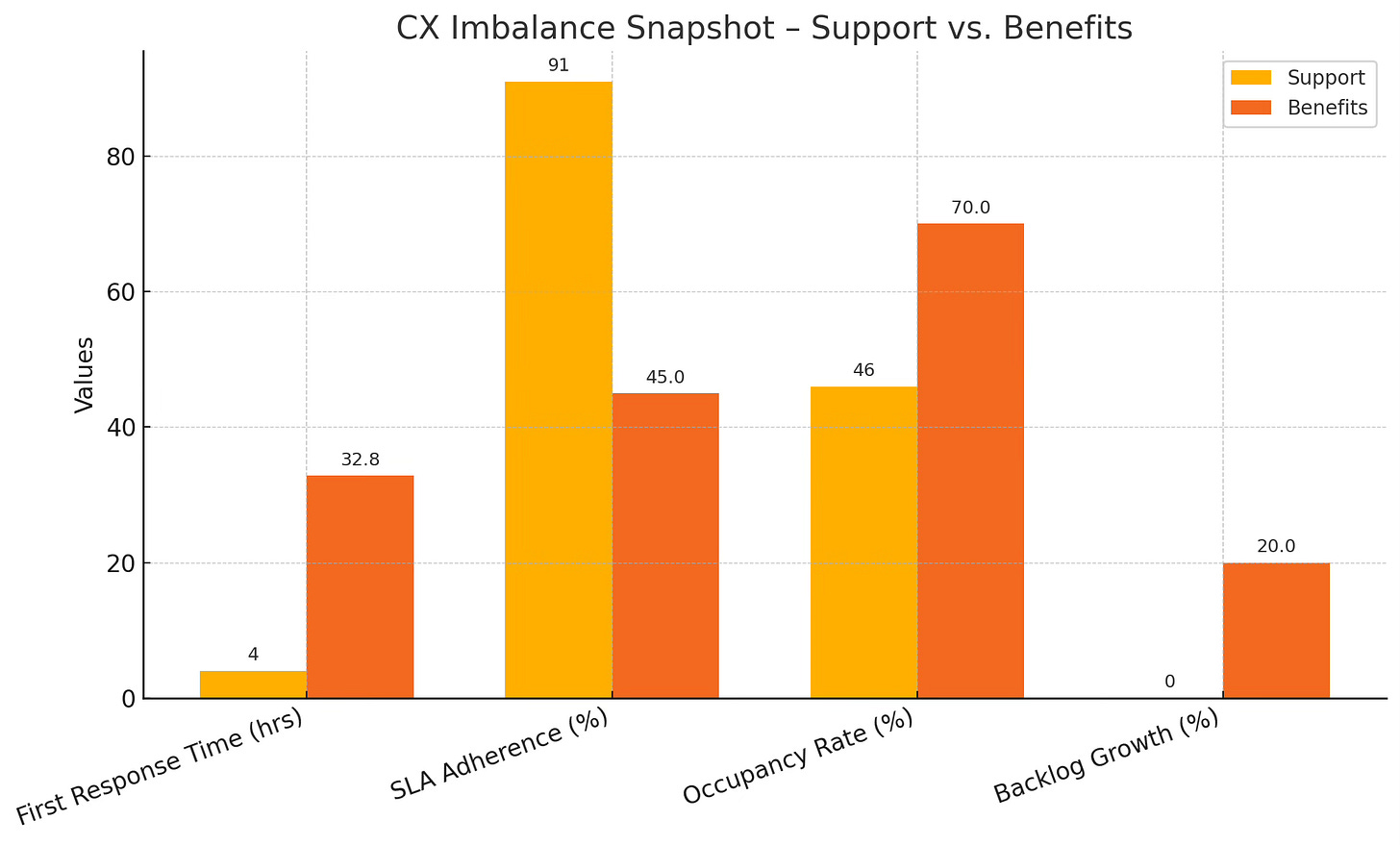 I recently dug into a case that hit close to home. Picture two teams, Support and Benefit Services, serving the same customers but acting independently. Support answered inquiries in 4 hours but sat idle half the time, with only 46% occupancy. Benefits, on the other hand, was drowning, missing over half their 24-hour response goals, with replies dragging out a day or more and a backlog that grew 20% over just a few weeks. Worse, 30% of tickets bounced between the two teams, leaving customers frustrated and agents burned out. This wasn’t a people problem. It was a structure problem. The team had scaled, but the model hadn’t. Hyper-growth doesn’t just test your CX, it exposes every crack in your foundation.